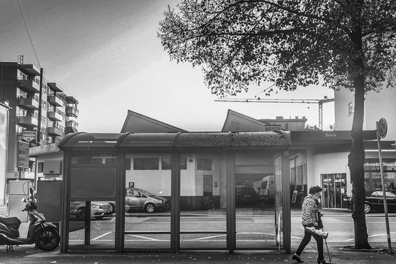 Istantanee realizzate sempre nello stesso luogo, sempre alla stessa fermata dell'autobus, sempre dallo stesso punto di vista.